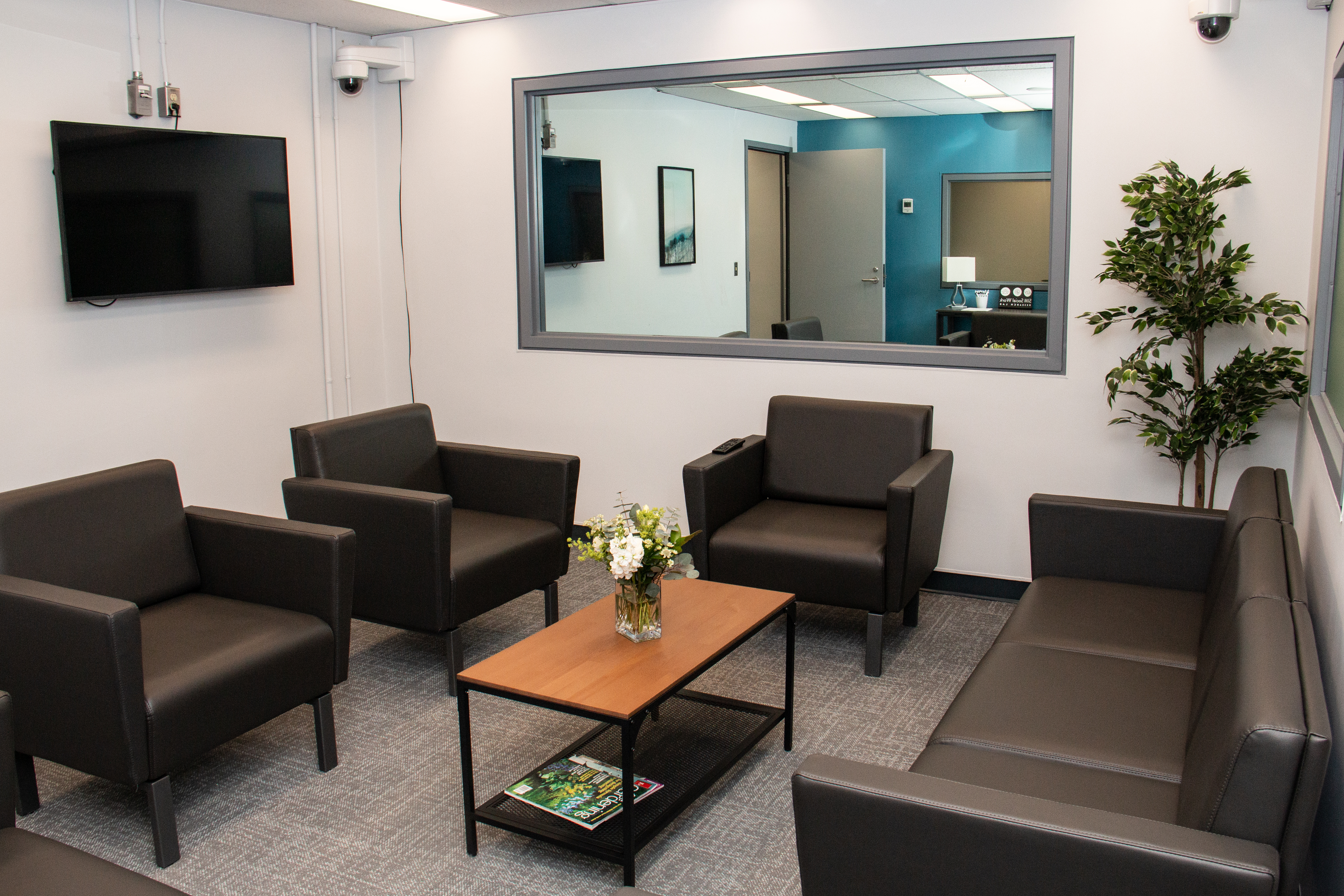 The lab is designed to reflect a realistic practice environment and includes a waiting and counselling room. The furniture in these rooms is moveable to replicate a broad range of agency and institutional settings, and to accommodate work with individuals, families, and small groups. The rooms are equipped with the latest AV Technologies. The counselling room includes a large screen for interacting with AI clients, and shares a one-way mirror to the observation room/office with computer equipment and access to a variety of research software.