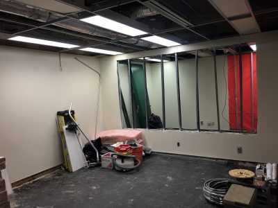 The building of the lab is in full swing. While this may not look like much, this is substantial progress. We have walls, and featured here is the cutout for the one-way mirror. Exciting times are shortly ahead. Stay-tuned!