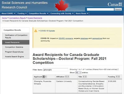Last month, our Lab Manager Ruxi Gheorghe was awarded the Social Sciences and Humanities Research Council (SSHRC) Canada Graduate Scholarship to fund her doctoral research. The objective of the Canada Graduate Scholarships–Doctoral (CGS-D) program is to promote continued excellence in Canadian research by rewarding and retaining high-caliber doctoral students at Canadian institutions.
