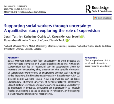 New article alert! Our Lab Research Associate Sarah Tarshis, alongside other scholars including the Lab’s Co-Director Katherine Occhiuto, Research Associate Karen Sewell, Lab Manager and Research Coordinator Ruxi Gheorghe, and Lab Director Sarah Todd, recently published the article Supporting Social Workers through Uncertainty: A Qualitative Study Exploring the Role of Supervision. The article was published in The Clinical Supervisor journal, and it highlights a portion of the findings from the SIM Lab’s recent project, “Knowing and Not Knowing: Navigating Uncertainty in Social Work Practice, (2020-2024).“