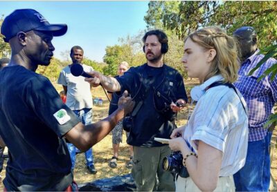 Two of last year’s interns on the ground in Zambia: Adam Tripp (with the microphone) and Sarah St-Pierre.