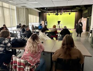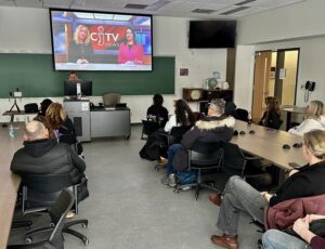 At the same time, in video, Kanina Holmes took participants through an explanation of Carleton’s video journalism offerings and then video technologist Dave Elliott guided those who wanted to take a turn on camera, reading a newscast from the teleprompter.