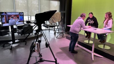 Video technologist Dave Elliott provides instructions to prospective students taking part in a newscast exercise.