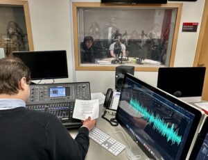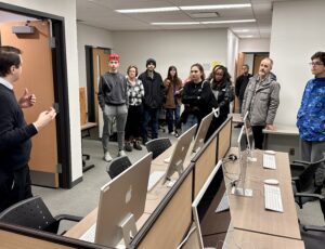 Audio technologist David Sarazin leads prospective students through a newscast exercise.