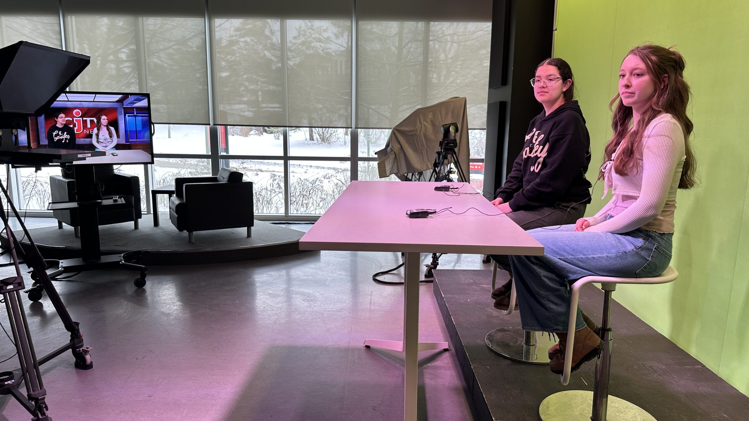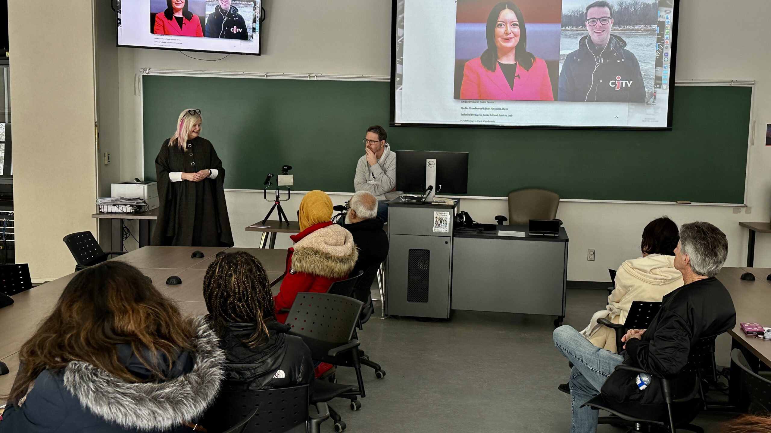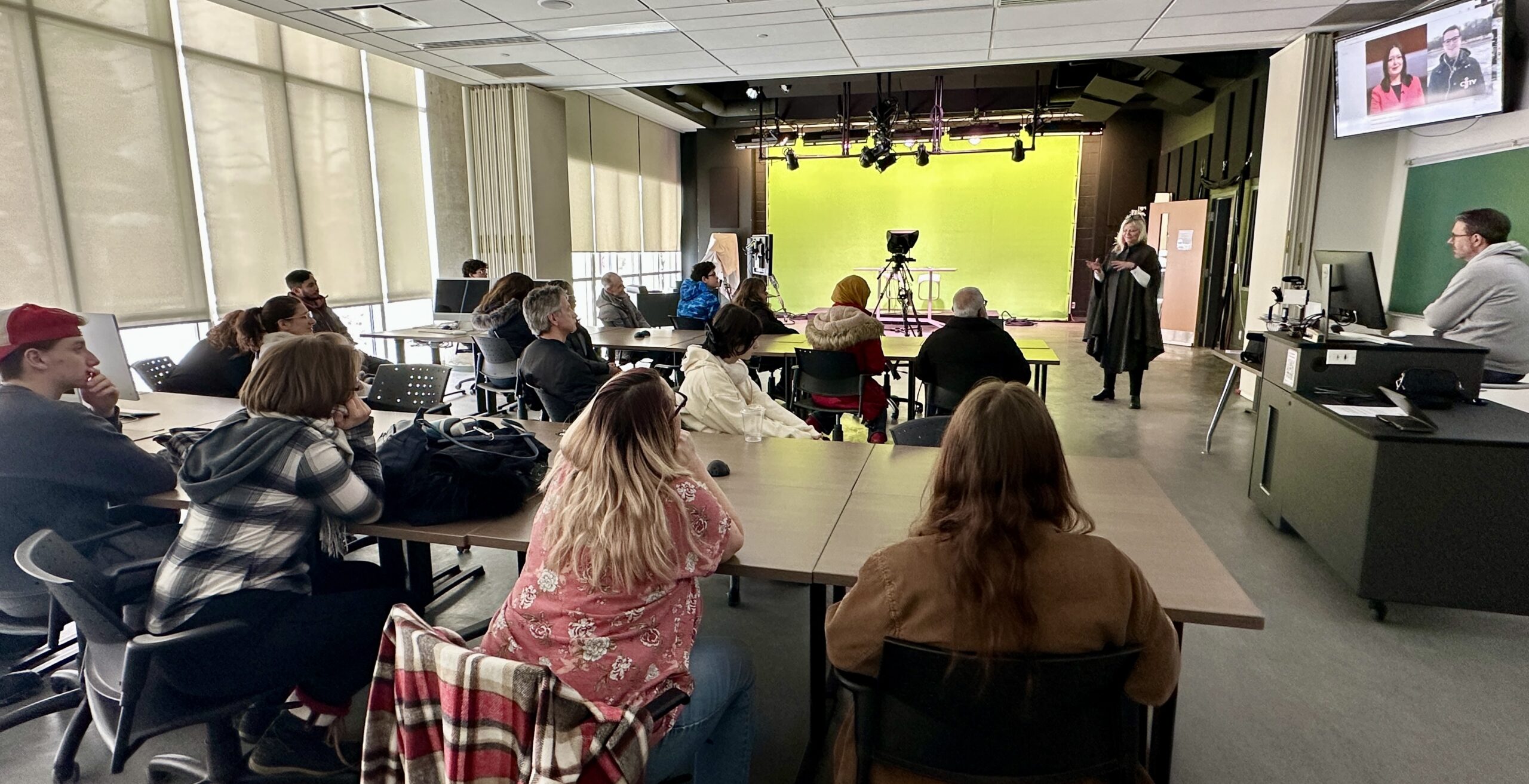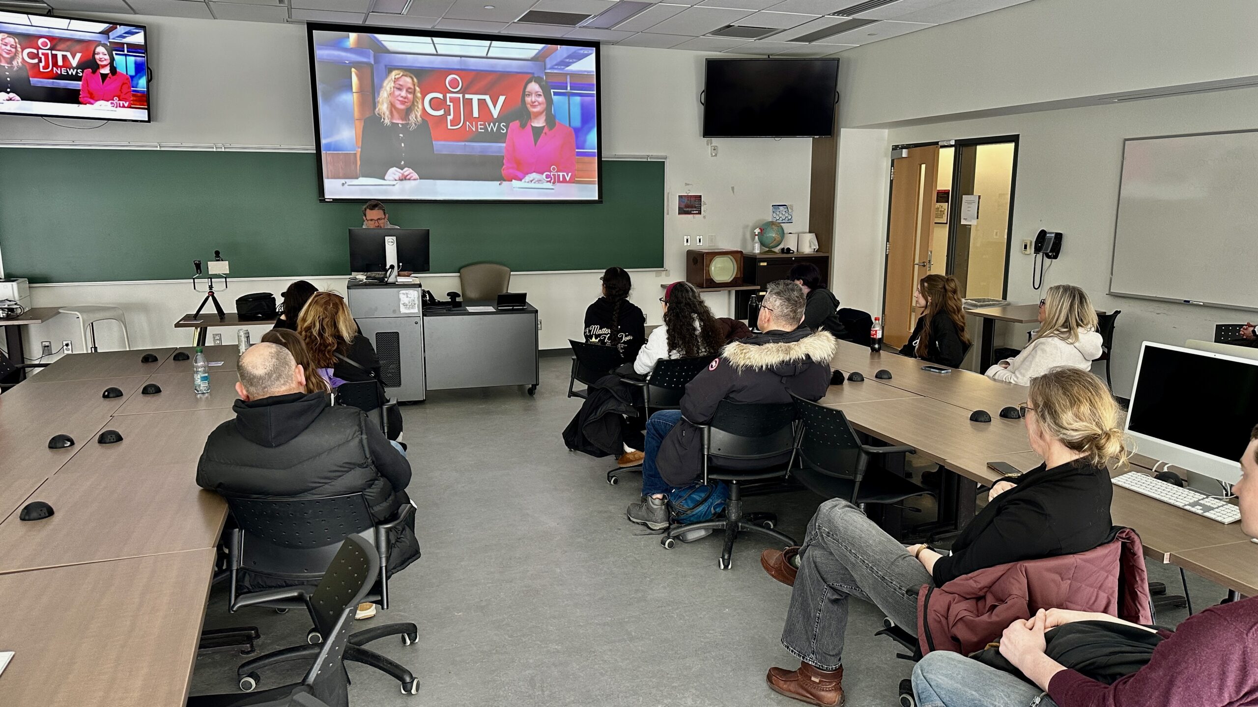 At the same time, in video, Kanina Holmes took participants through an explanation of Carleton’s video journalism offerings and then video technologist Dave Elliott guided those who wanted to take a turn on camera, reading a newscast from the teleprompter.
