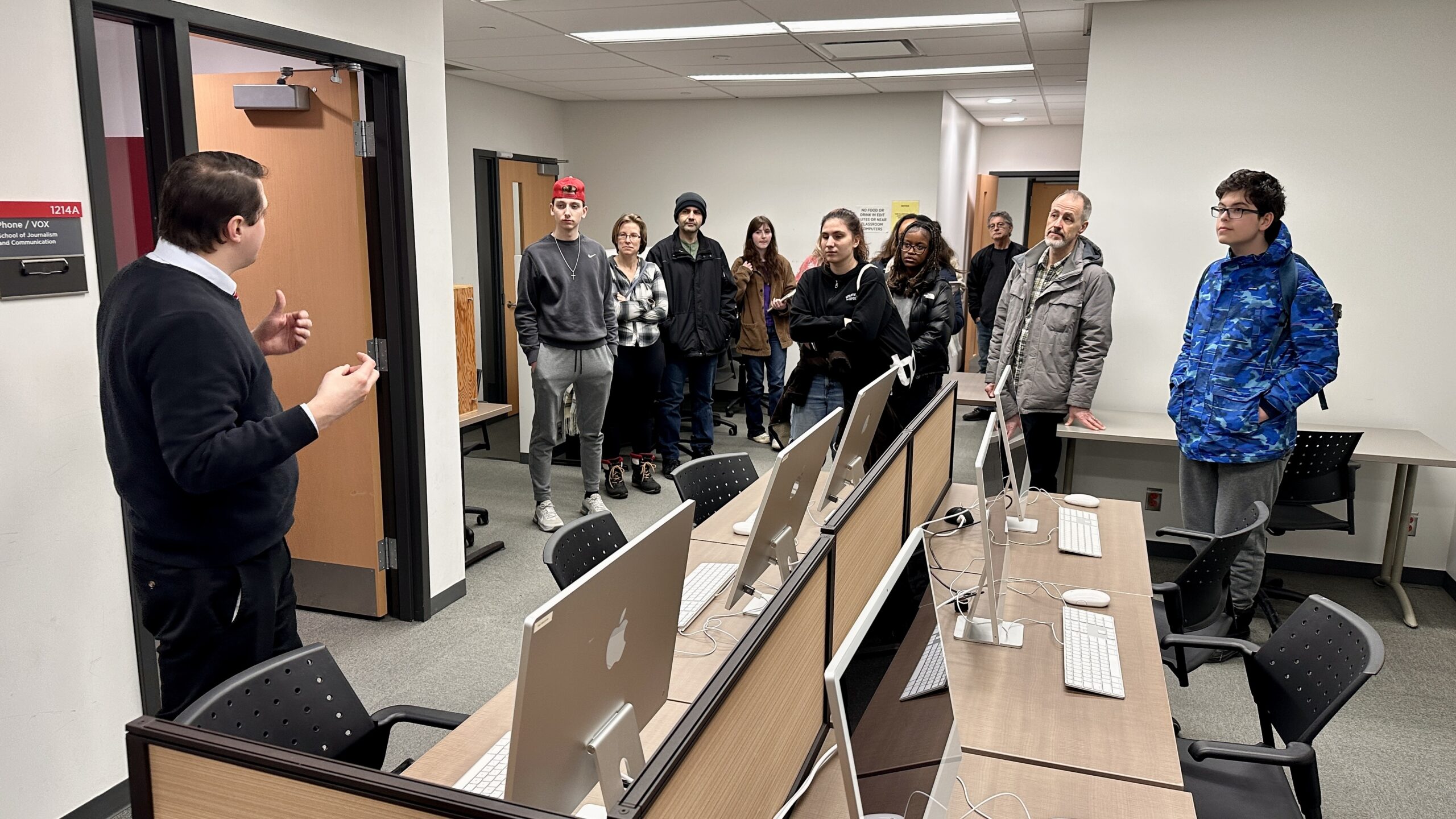 Audio technologist David Sarazin leads prospective students through a newscast exercise.