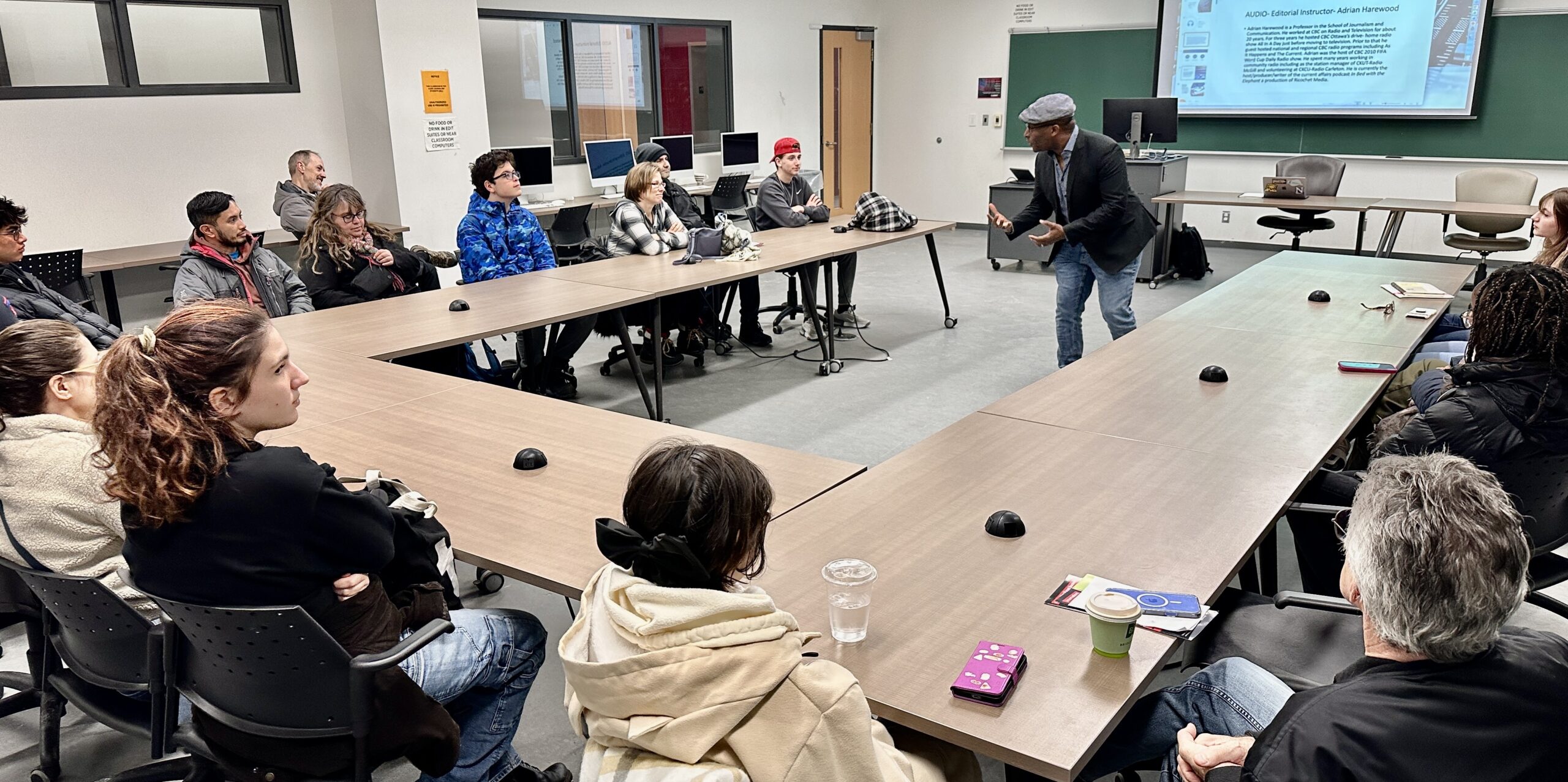 During the hands-on workshops, Adrian Harewood provided a primer on audio storytelling, followed by a mock radio newscast workshop led by audio technologist David Sarazin.