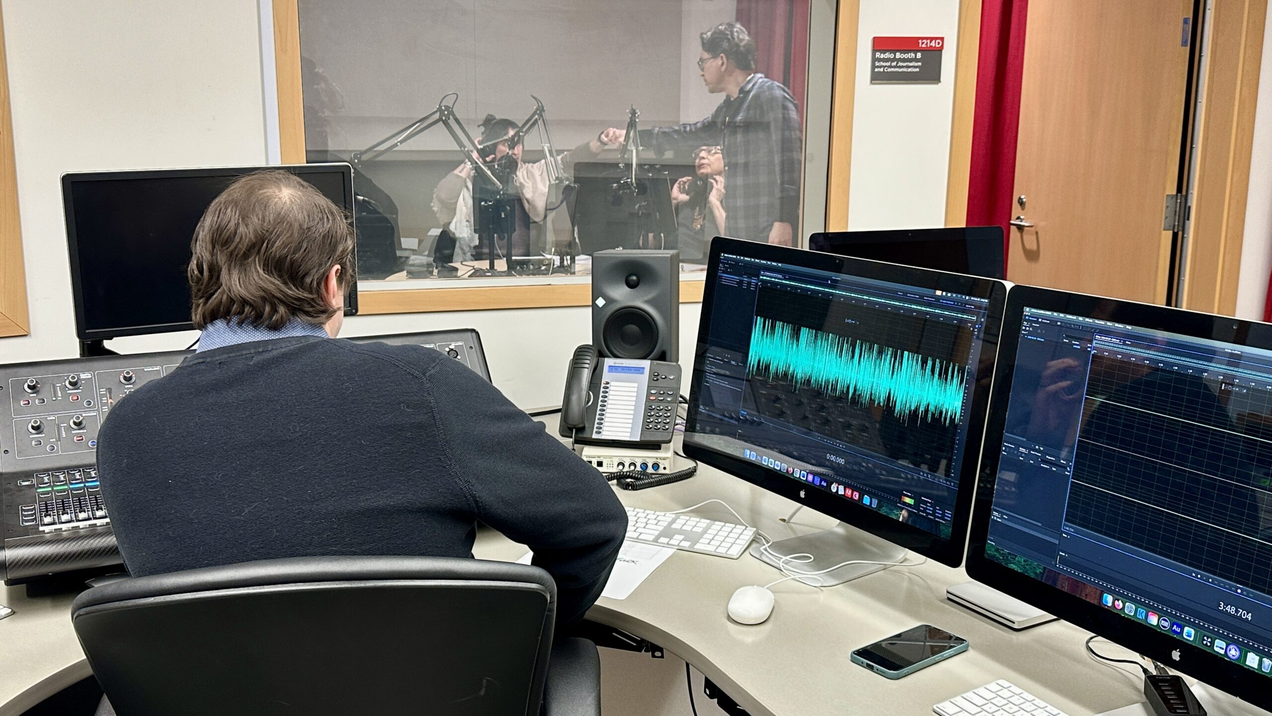 And for the rest of the week, under the guidance of contract instructor Rhiannon Johnson, the 17 students in the program came together for their Introduction to Audio Journalism course, delivered in Carleton’s audio studio. Johnson is a Michisaagiig journalist who grew up in Hiawatha First Nation in southern Ontario. She is a producer for CBC’s Unreserved, which is the radio space for Indigenous community, culture, and conversation.