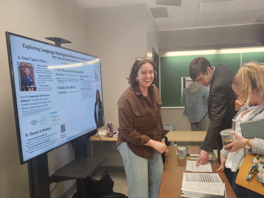 Topics ranged from the history of Kwa’kwala documentation and language ideological debates in French-Language press to linguistic performativity in tabletop role-playing games and AI-assisted research writing by Chinese doctoral students. Students shared research on second language vocabulary learning, phrasal verb preferences, corrective feedback in advanced EFL classrooms, and the impact of spacing and input modality on learning figurative phrasal verbs.