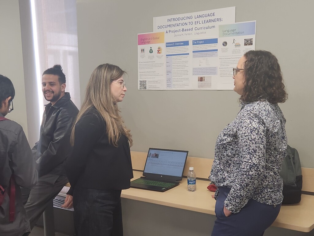 Additionally, students shared studies on ethical art in Youtube video essays, the portrayal of masculinity in queer women’s discourse, and POLITICO’s coverage of Catalan as a language of the European Union. Other topics included multimodality and learning disabilities in writing, plurilingualism and language assessment, and the introduction of language documentation to EFL learners.