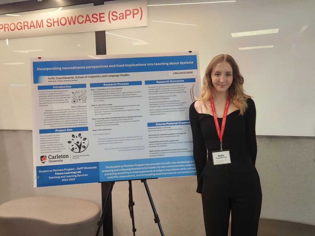 Holly Zayachkowski, an upper-year linguistics student, also shared her experience with the Students as Partners Program at the Showcase. Partnered with Professor Tamara Sorenson Duncan, Zayachkowski helped rework the dyslexia unit content for the LING/ALDS 3604 course, Communication Differences and Disabilities II, last summer.