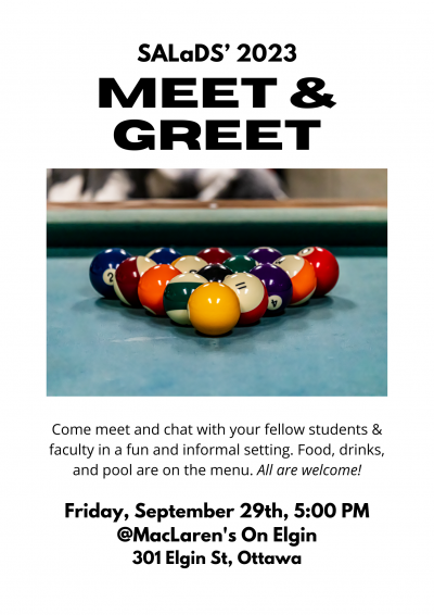 Please join the Graduate Student Society of Applied Linguistics and Discourse Studies (SALaDS) for a Meet and Greet event at MacLaren’s on Friday, September 29th at 5:00 p.m.