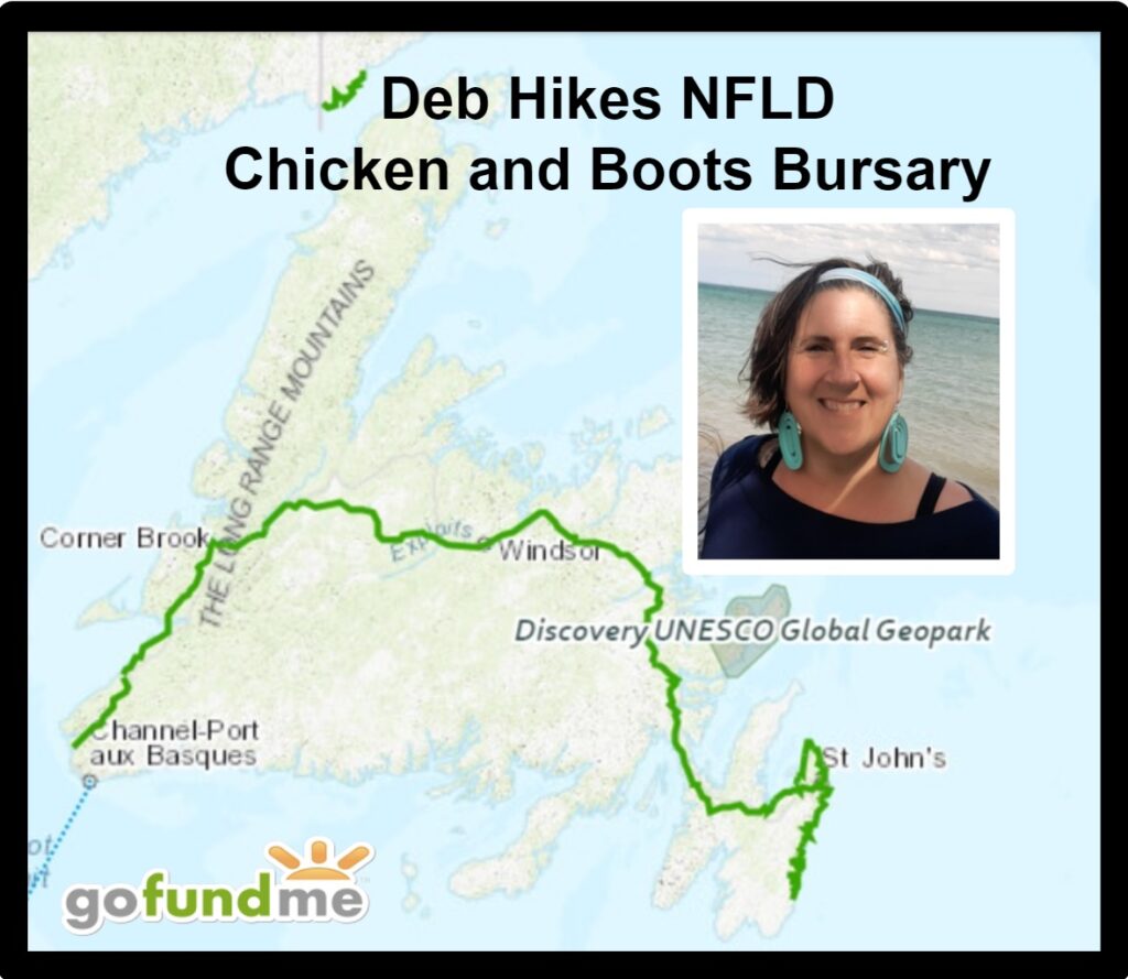Tax-deductible donations can be made to “Deb Hikes Newfoundland: Chicken and Boots Bursary” on GoFundMe (all funds raised go directly to the bursary).