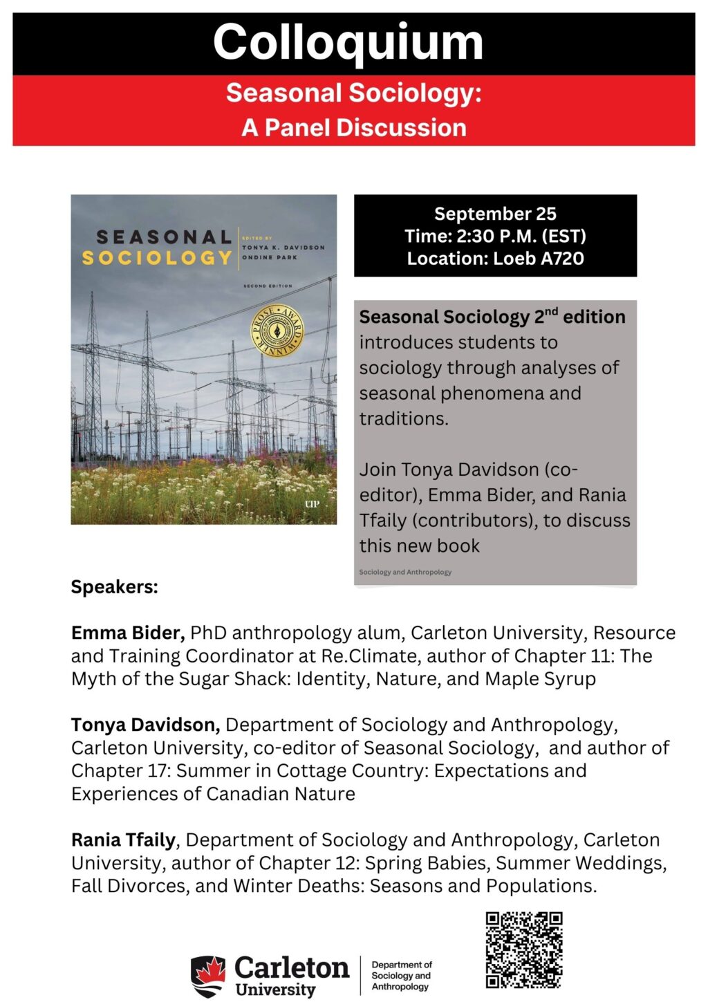 Tonya Davidson, Department of Sociology and Anthropology, Carleton University, co-editor of Seasonal Sociology, and author of Chapter 17: Summer in Cottage Country: Expectations and Experiences of Canadian Nature