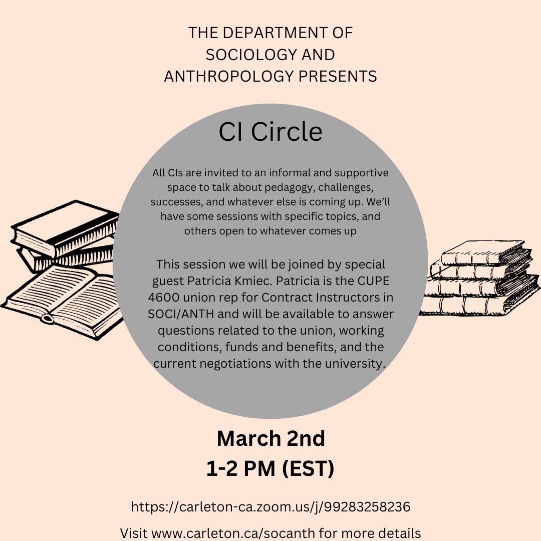 This session we will be joined by special guest Patricia Kmiec. Patricia is the CUPE 4600 union rep for Contract Instructors in SOCI/ANTH and will be available to answer questions related to the union, working conditions, funds and benefits, and the current negotiations with the university.