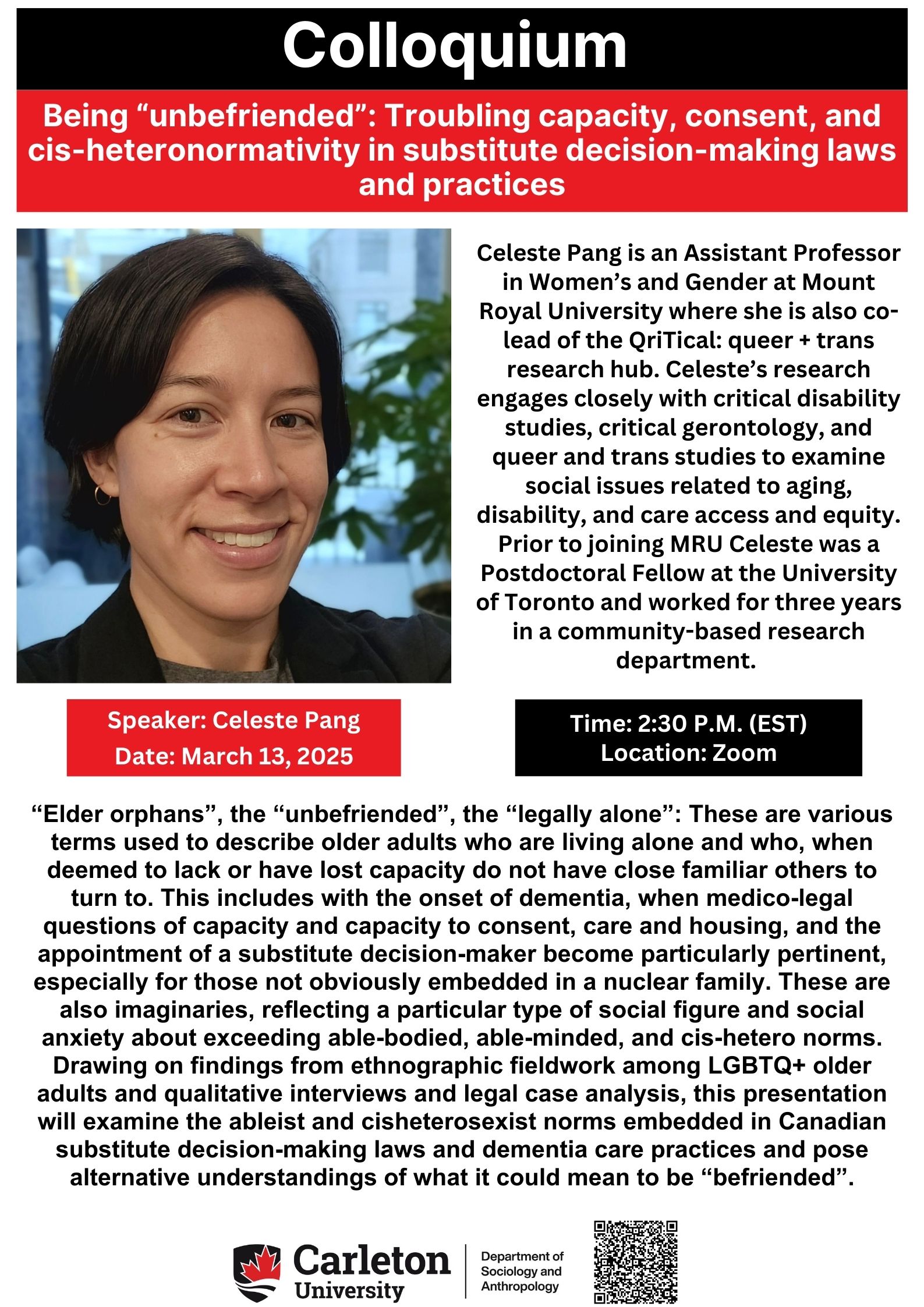 As part of the Department of Sociology and Anthropology Colloquium Series, Celeste Pang presents: “Being “unbefriended”: Troubling capacity, consent, and cis-heteronormativity in substitute decision-making laws and practices.”