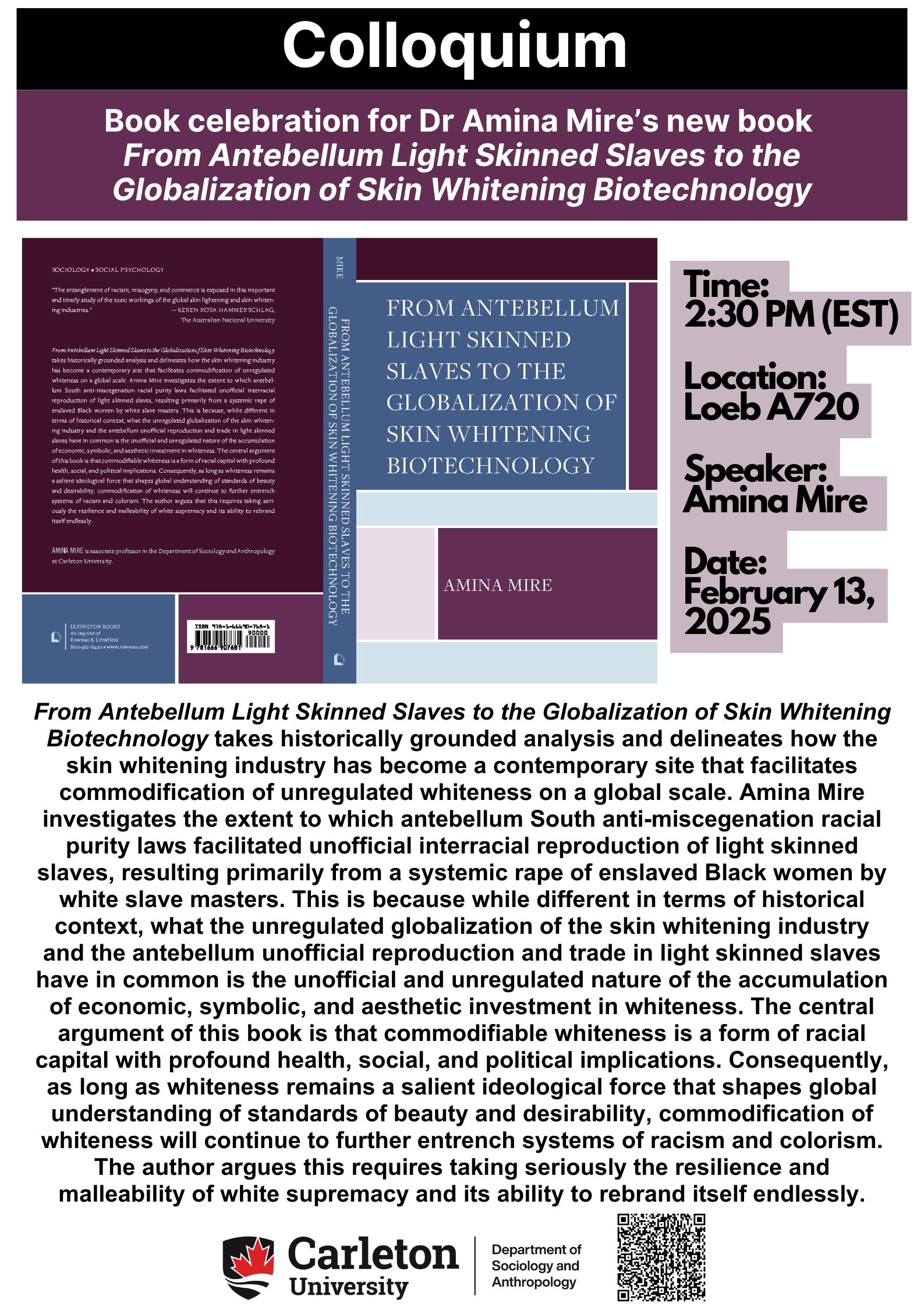 Colloquium: Book celebration for Dr. Amina Mire’s new book From Antebellum Light Skinned Slaves to the Globalization of Skin Whitening Biotechnology