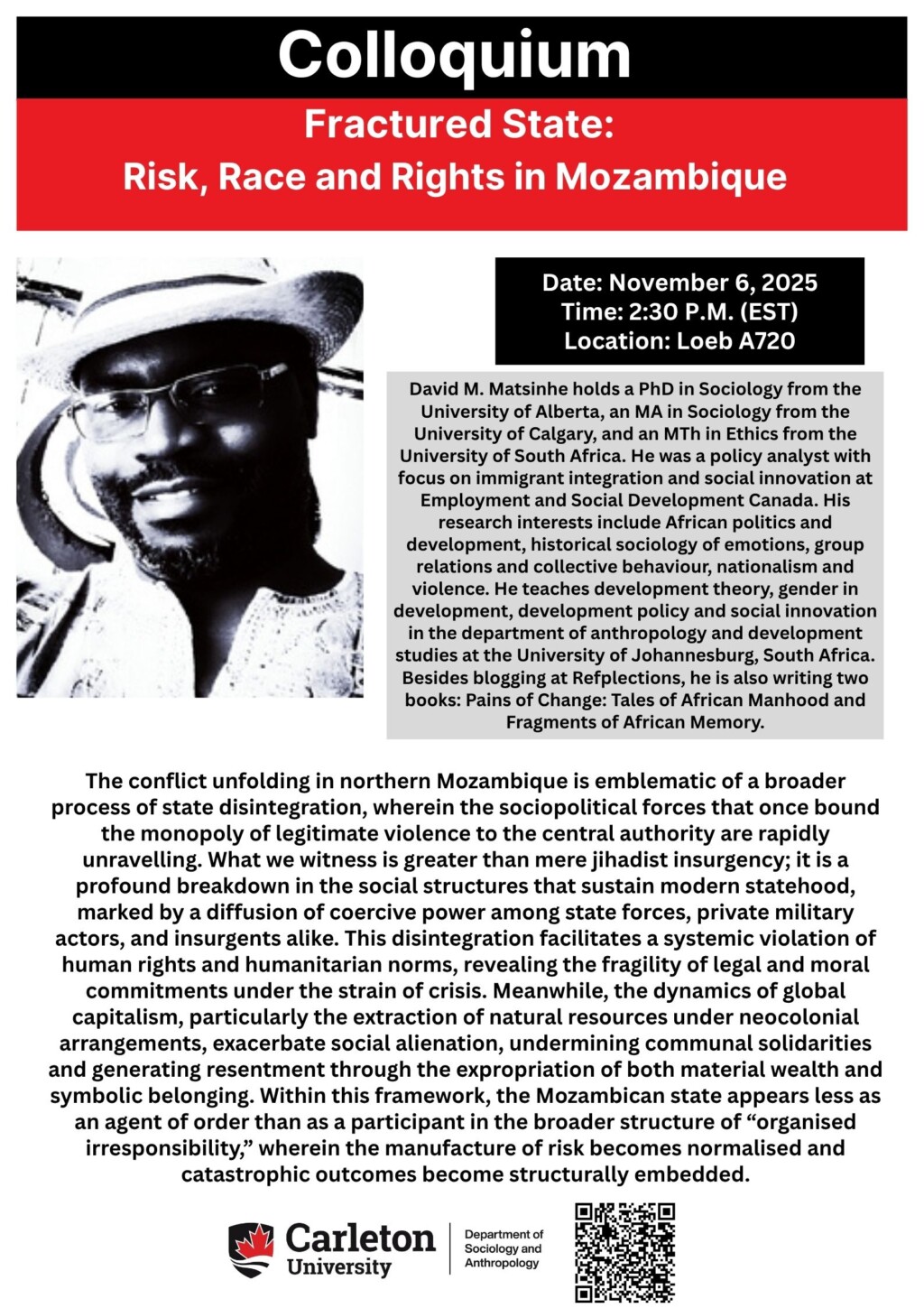 The Department of Sociology and Anthropology’s Colloquium Committee is pleased to invite you to the next event in our colloquium series: Fractured State: Risk, Race and Rights in Mozambique