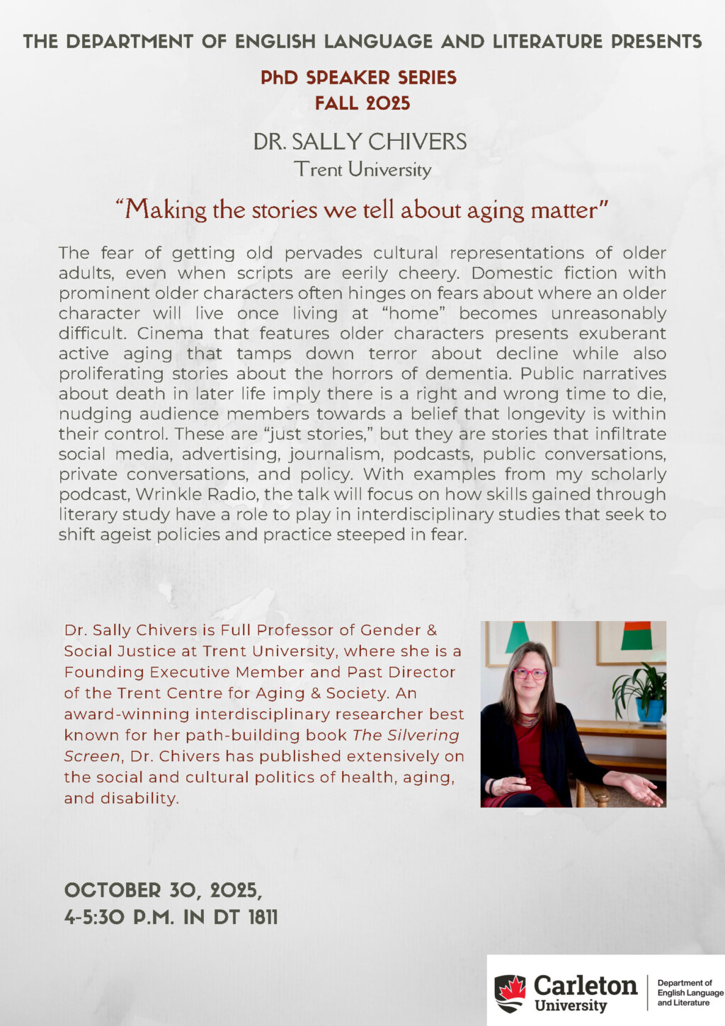 The Department of English warmly invites faculty and graduate students in FASS to join us for the PhD Speaker Series fall 2025 lecture. We are thrilled to welcome as the speaker Dr. Sally Chivers (Trent University), author of The Silvering Screen: Old Age and Disability in Cinema (UTP, 2011).
