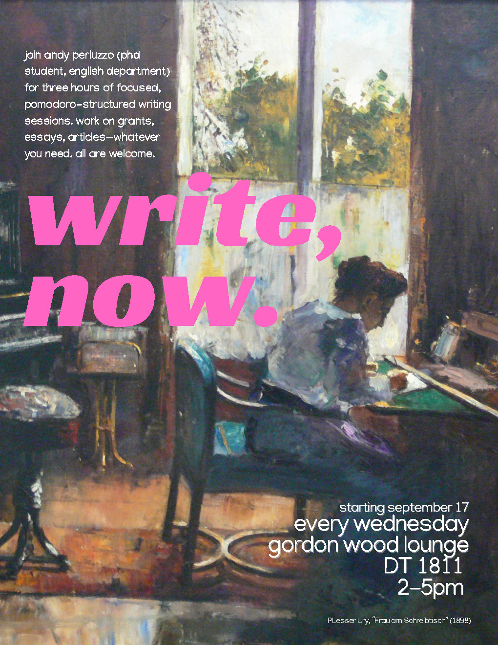 My name is Andy Perluzzo (she/they), and I am a PhD student in Carleton’s English Department. I’m happy to share that I will be starting up my weekly “Write Now” sessions for the fall term; I invite any interested graduate students to join me, every Wednesday, from 2:00 PM to 5:00 PM in the Gordon Wood Lounge.