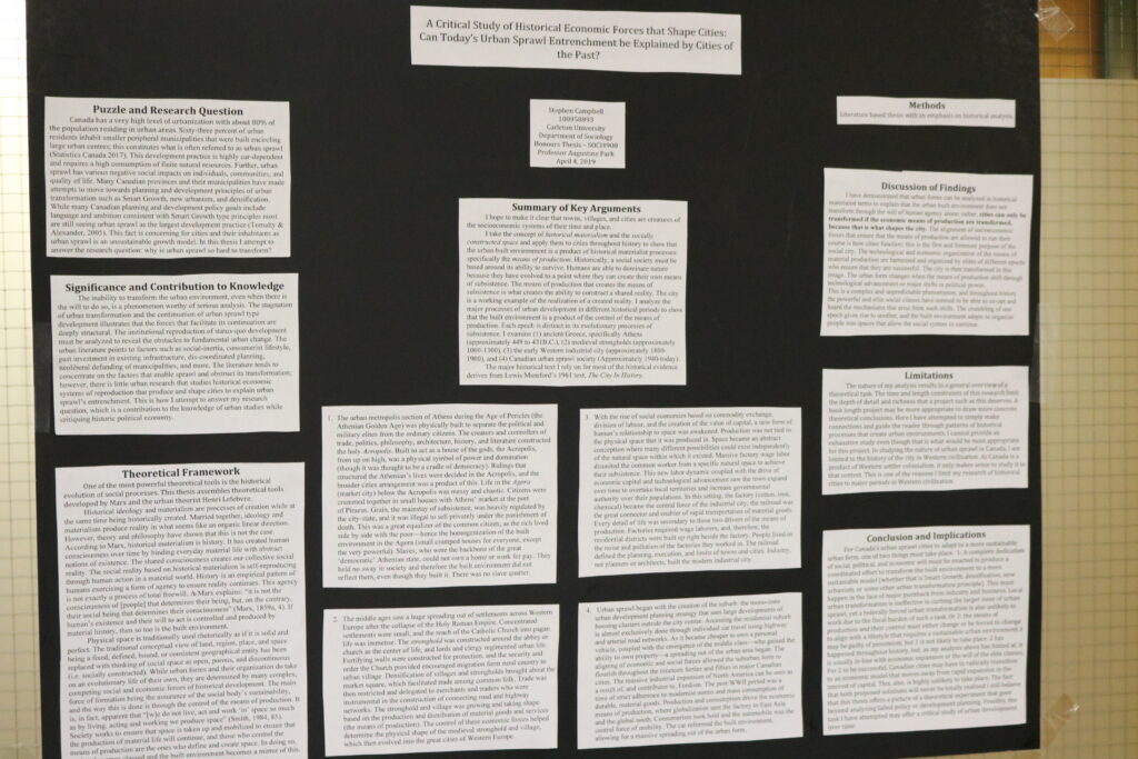 Tiffany Isesele (left) examined social housing and access to quality nutritional food in Ottawa. Mackenzie Plumb (right) explored discourses from government and activists concerning Ottawa’s new prison. | Stephen Campbell explored historical economic forces that shape cities, and how urban sprawl entrenchment can be explained by cities of the past. |