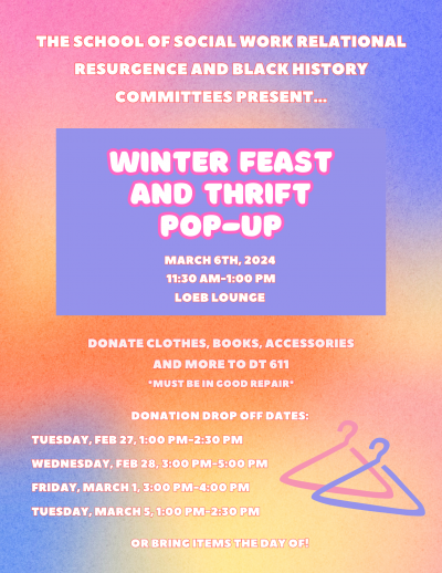 The School of Social Work’s Relational Resurgence and Black History Committees are organizing a Winter Feast and Thrift Pop!