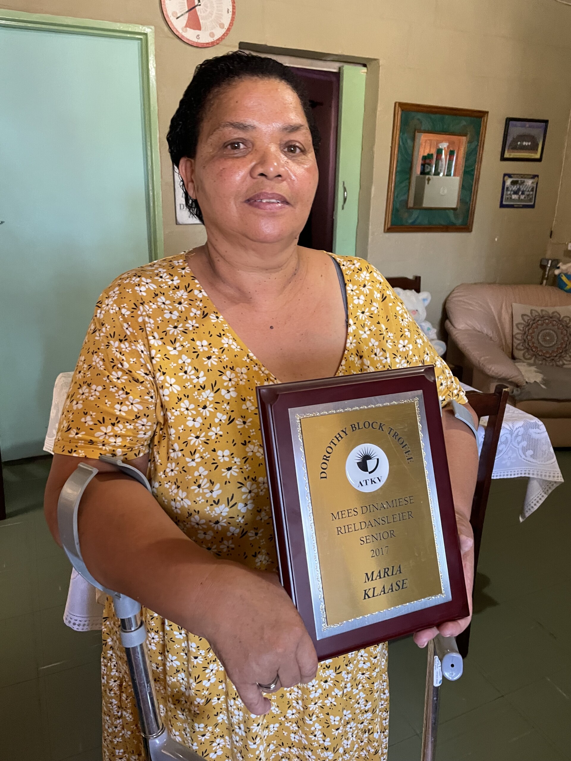 Ms. Maria Klaase is an experienced instructor and retired performer of rieldans, a style of Khoisan social dance. Ms. Klaase is the longtime director of the Loeriesfontein Rieldans group, which has won several titles in regional and national competitions. Ms. Klaase has received several awards as a rieldans performer herself, including the ATKV Dorothy Block trophy awarded to the best senior riel dancer. She resides in Loeriesfontein, Northern Cape.