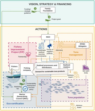 Tuna fisheries provide over 5 million tonnes of seafood annually to the global market but have historically raised conservation concerns due to weak management measures and impacts on non-target wildlife. The focus of the first environmental awareness campaigns in seafood focused on dolphin bycatch in tuna fisheries in the 1980s. Since then, the sustainable seafood movement has evolved considerably, with philanthropic foundations playing a key role as agenda-setters and funders of work carried out by non-governmental organizations (NGOs). Here, we used tuna as a case study and investigated how three US foundations and associated NGOs have affected tuna fisheries reform through two primary pathways: advocacy for improved fishery management at intergovernmental meetings, and engagement with fishing companies in fishery improvement projects (FIPs). We found a total of USD 28.65 million was allocated to tuna-related work from 2013 to 2021. While each foundation had different funding profiles, 65% of all grant funds were directed to two key priority areas: market leverage and RFMO advocacy. Further, almost 60% of all funding was allocated to only three NGOs, all of which are central actors at RFMO meetings, and which are collectively engaged in over 85% of all tuna FIPs (by volume). We reflect on how this concentrated funding relates to the overarching sustainable seafood agenda of these foundations and provide recommendations to ensure financial support and objectives remain transparent and do not perpetuate inequities between tuna fishing countries. Read full online article