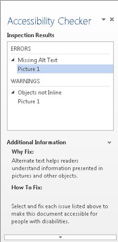 Fixing some issues might require you to change, reformat or update your content. The Accessibility Checker also lets you know about Office features you can use to make your content more accessible.
