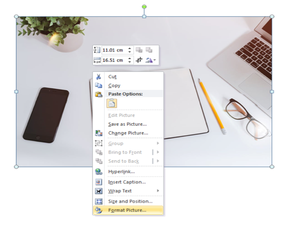 - Right-click the image or object, and then click Format Picture/Format Shape (for tables, click Table Properties).