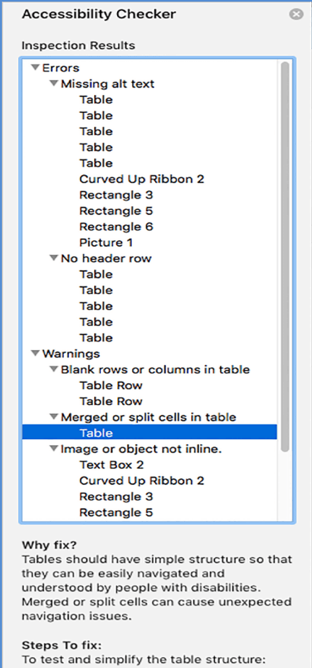 - To view and repair issues, click on the items in the Accessibility Checker window (see the next section for correcting errors in accessibility report)