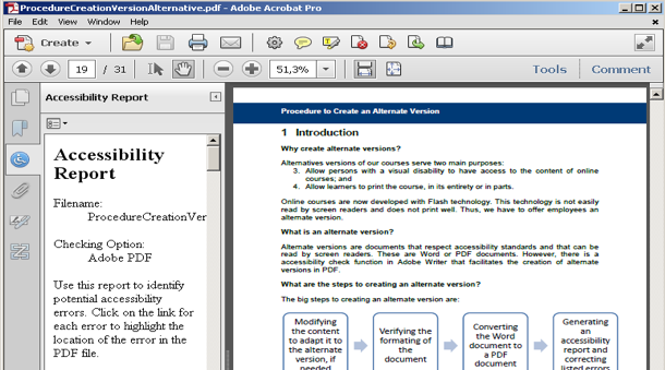 IMPORTANT: It is strongly recommended that you correct any errors the Accessibility Checker finds. It is also recommended that you add alt text in the Word document instead of the PDF, so as to facilitate the updating of the alternative version. Generate the report until there are no errors left.