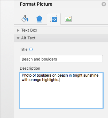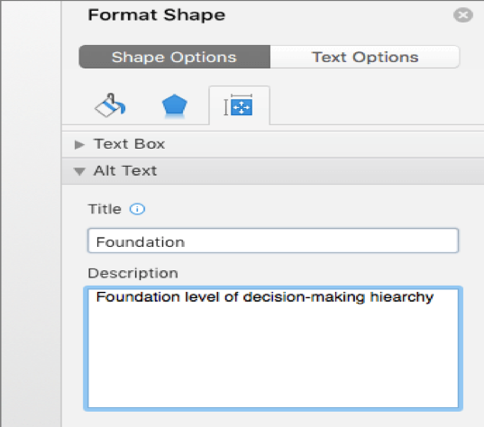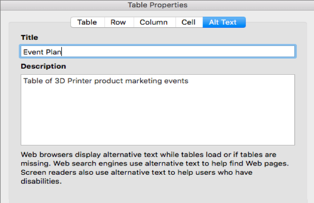 Alternative text, also known as “alt text,” appears when you move your pointer over a picture or object; it sometimes also appears as a title. Alt text helps people who use screen readers understand the content of images in your document. For many readers, this is the only information they have about the images and objects in a document. Alt text should be included for any of the following objects: