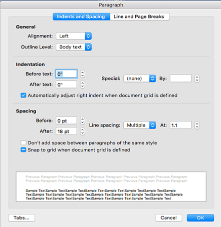 - Select Line and Paragraph Spacing > Line Spacing Options. The Paragraph dialog opens, showing the Indents and Spacing tab