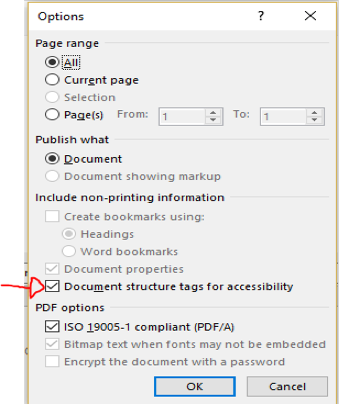 - Make sure the option Document structure tags for accessibility is selected, and then click OK