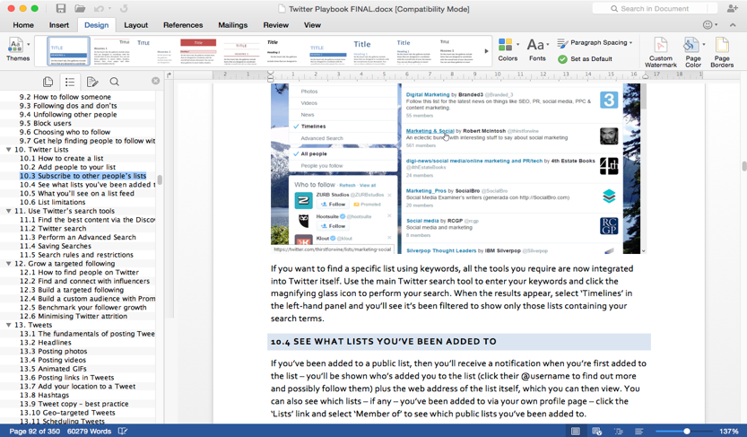 You can view and update your document’s organization by clicking the View tab in the Show group, and/or by clicking the Navigation Pane check box. To help maintain clear navigation, make sure you have at least one heading about every two pages, and confirm that your headings are in the correct order (Heading 2 under Heading 1, etc.).