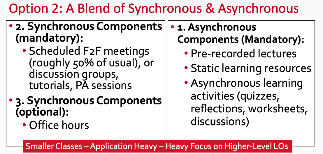 In addition to a synchronous approach to online teaching, you can consider leveraging asynchronous options. Courses with an asynchronous component can be: