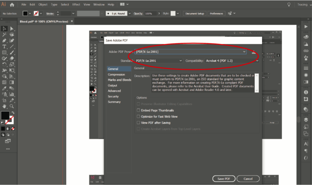 - Ensure ‘PDF/X-1a:2001’ is selected in the ‘Adobe PDF Preset’ dropdown menu