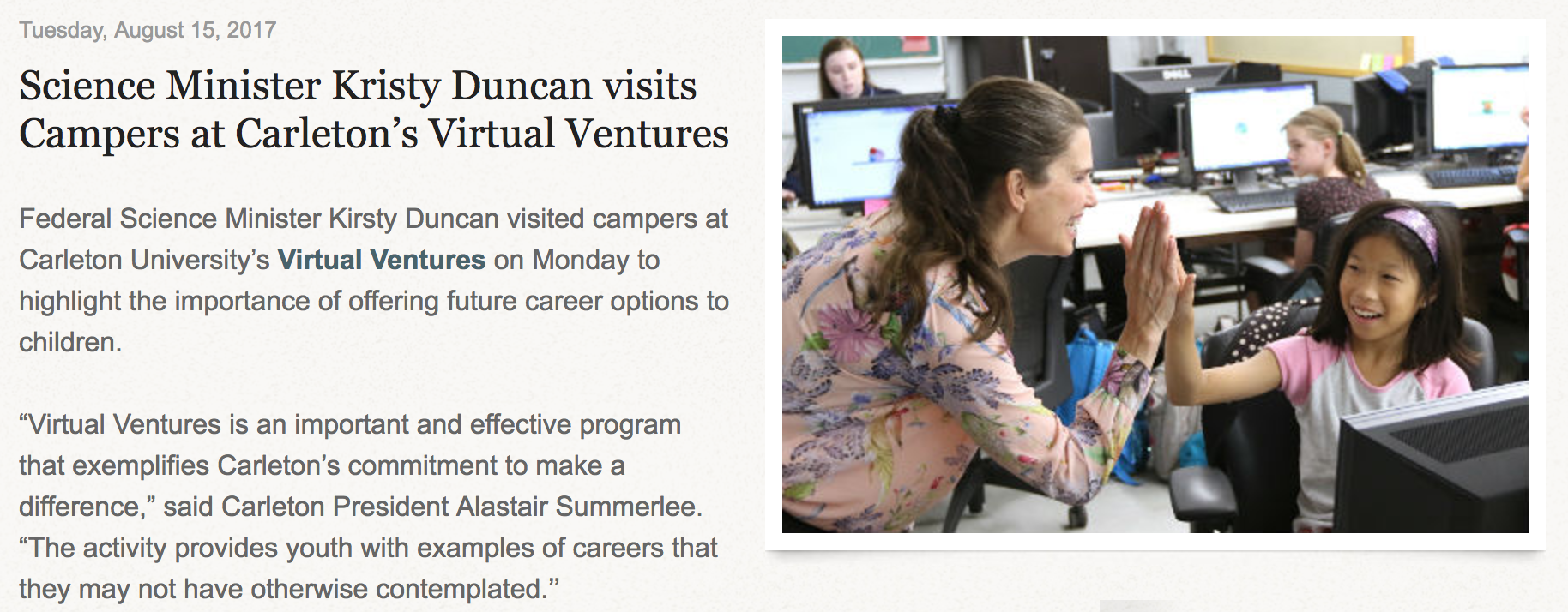 Science Minister Kristy Duncan visits Campers at Carleton’s Virtual Ventures